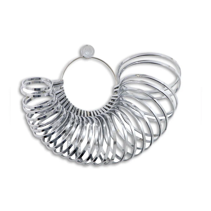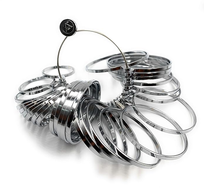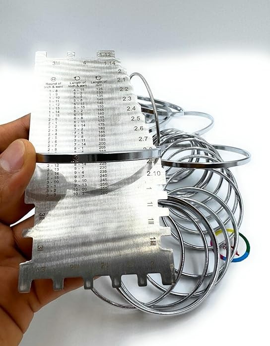 Crafted from smooth, rust-resistant polished metal, the rings are securely looped on a metal holder for easy selection and quick reference. Whether you’re custom-making bangles or helping customers try sizes, this tool delivers both precision and durability.