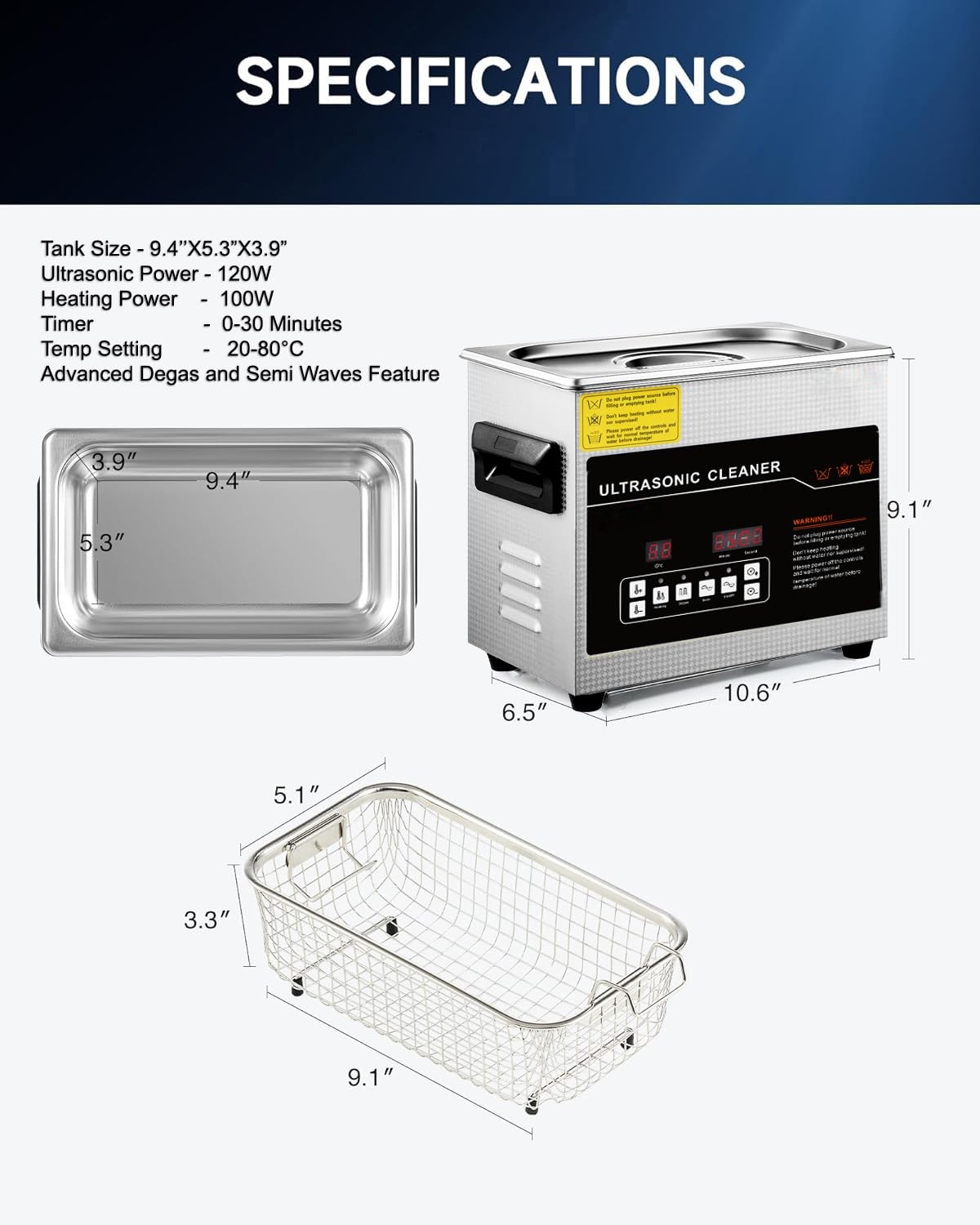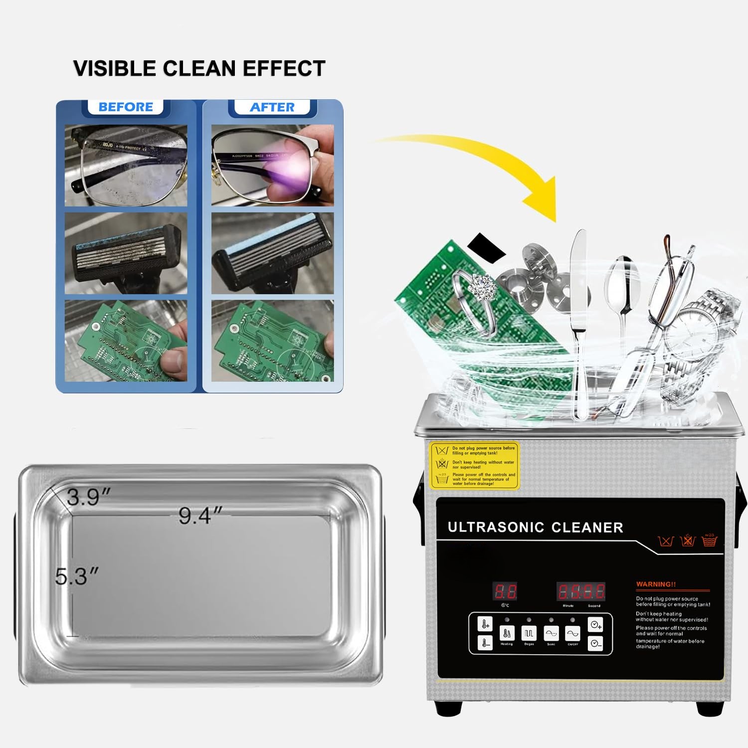 - High-Quality SUS304 Tank – 9.44 × 5.31 × 3.93 inch Durable stainless steel tank (240×135×100mm) ideal for cleaning rings, chains, dental tools, carburetor parts, watch components, injectors, lenses, and small electronic items.